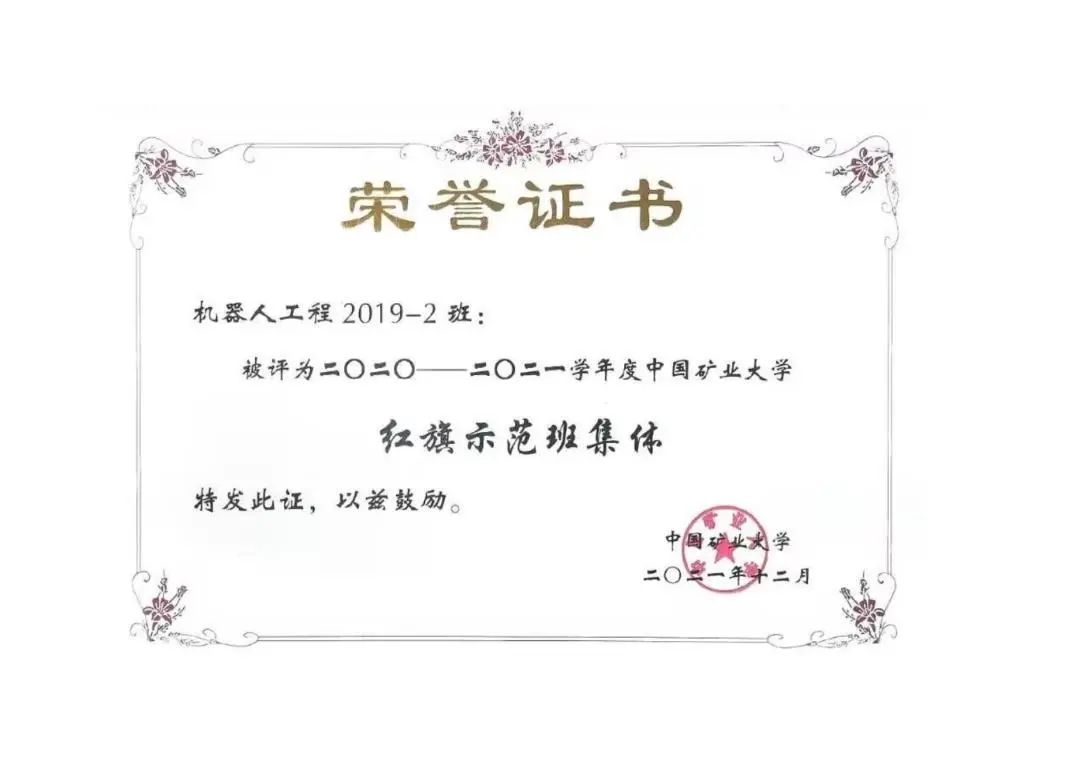 机器人工程2019-2班团支部是由27人组成的大家庭,2022年6月被江苏省教育厅评为江苏省省级“先进班集体”;2021年5月被共青团中国矿业大学委员会评为校“十佳团支部”;2021年12月被中国矿业大学评为校“红旗示范班集体”;2022年5月,被共青团中国矿业大学委员会评为校“优秀团支部”;2022年12月被中国矿业大学评为校“先进班集体”;2022年10月,团支部作为学校“活力团支部”被推荐至团省委“团学苏刊”微信公众号进行风采展示。